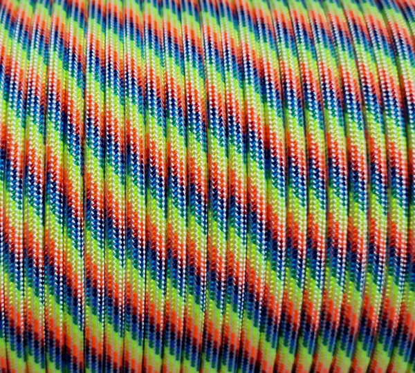 Paracord 550 libras com 7 filamentos e 4mm de espessura, suporta até 250 kg de tensão, carga de trabalho até 25 kg.